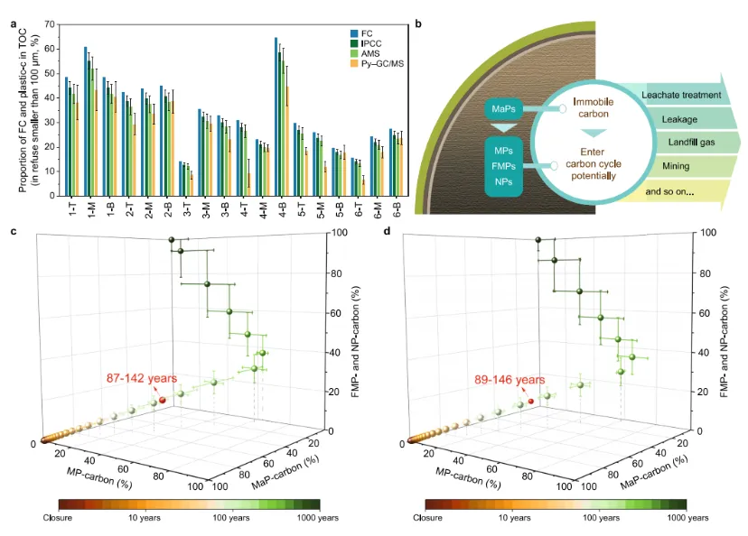 Fig.5c:根据零级动力学模型,随着时间推移,填埋场内可迁移的微纳塑料碳比例逐年上升,预计在87-146年间,约50%的塑料碳将具备进入碳循环的潜力。