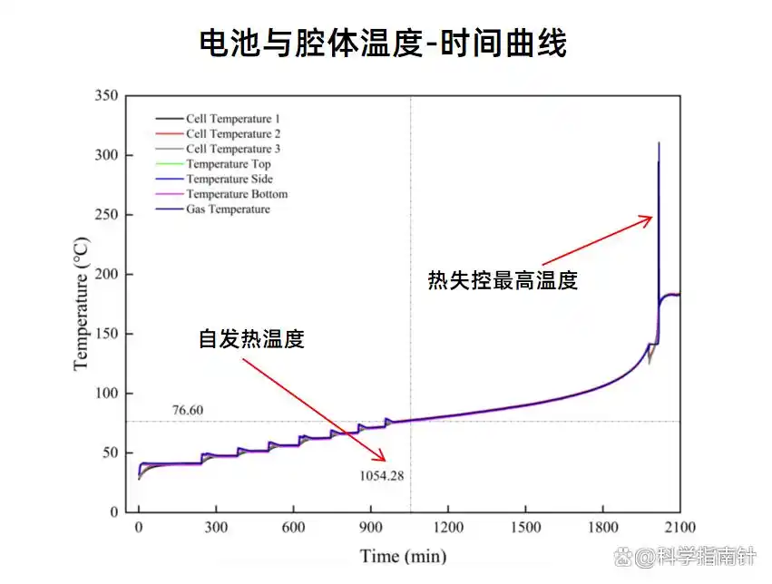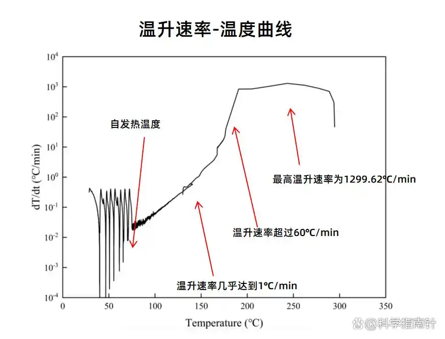 该曲线是电池热反应动力学的直观呈现。电池在76.60℃触发0.02℃/min自放热阈值,标志热失控起始(自发热温度点 );后续温升速率从近1℃/min跃升至超60℃/min(如190.62℃时达839.51℃/min ),最高至1299.62℃/min(243.28℃时 ),反映热失控进程中,电池内部副反应(SEI膜分解、电解液燃烧等 )依次激活,热量累积速率指数级增长,热失控进入自持加速阶段。