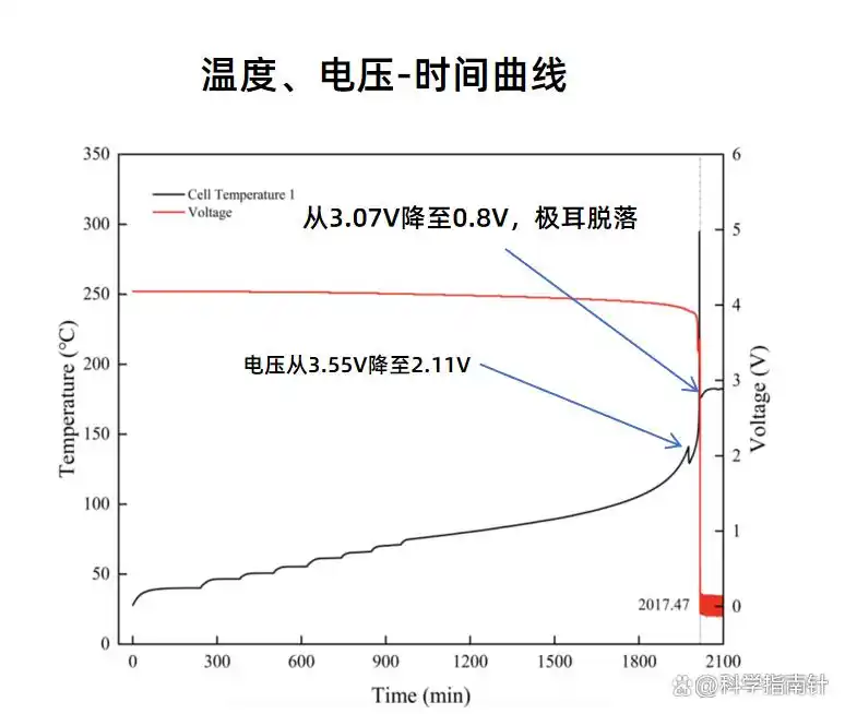 电压与温度协同变化,揭示热 - 电耦合失效机制。热失控中,电池内部物理化学结构破坏(如隔膜熔融、活性物质粉化 ),导致电压从3.55V骤降至2.11V(166.11℃时 ),极耳脱落时电压从3.07V崩至0.8V,最终因电池破裂短路,电压趋近0V。电压突变节点与温度关联,精准对应热失控进程中电池电化学体系崩溃阶段,为热失控电安全预警提供判据。