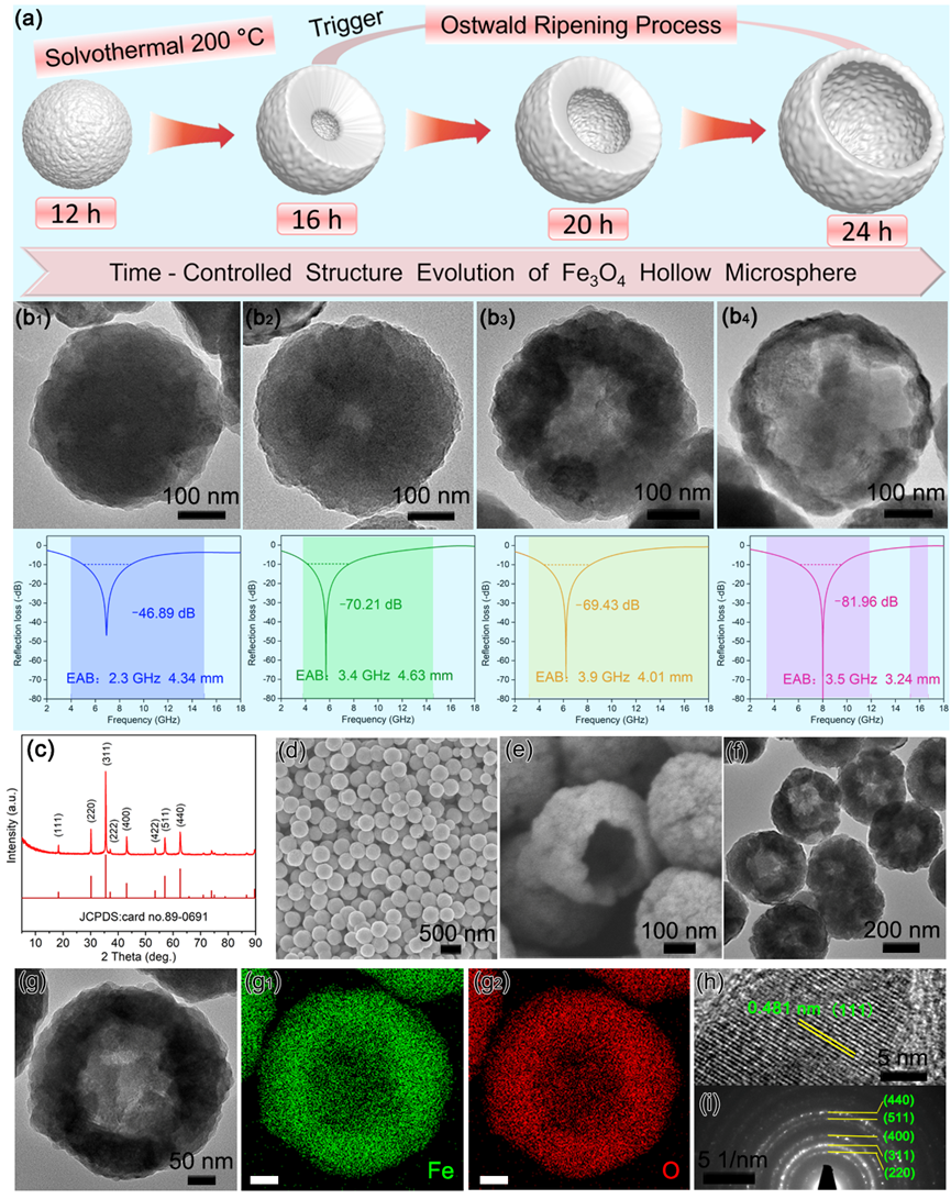 图1Fe3O4空心微球的微观结构表征。(a) Fe3O4空心微球形成过程示意图和(b) Fe3O4空心微球时间控制结构演化的TEM图,(c) XRD图,(d, e) SEM图,(f, g) TEM图及相应的Fe和O元素映射图,(h) HRTEM图,(i) SAED图。