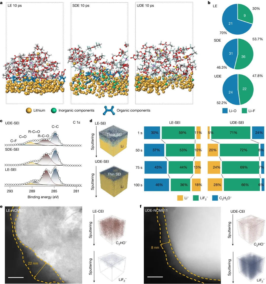 UDE1分解产物中无机物占比达53%,形成薄SEI(8 nm)