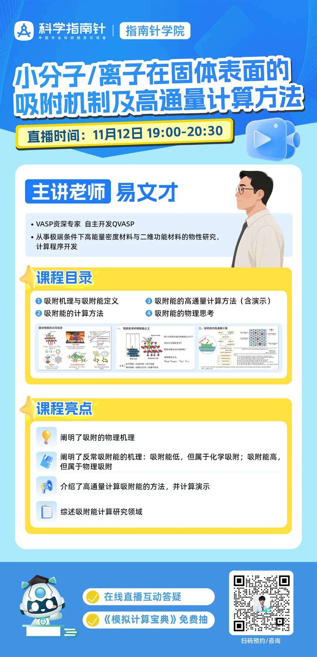 明晚7点,我们特邀曲阜师范大学易文才副教授,带来公开课《小分子/离子在固体表面的吸附机制及高通量计算方法》。课程将系统讲解吸附的物理机理、反常吸附能的机理及高通量计算吸附能的方法,并演示其自主研发的“气敏传感器和催化剂自动筛选软件包(GASCAP)”,为您提升材料设计与筛选效率。