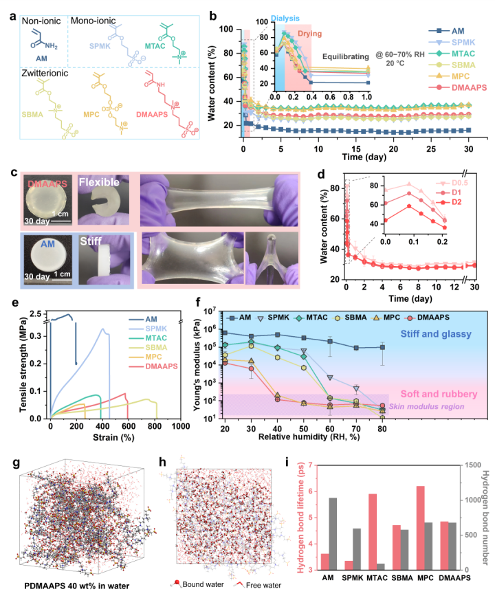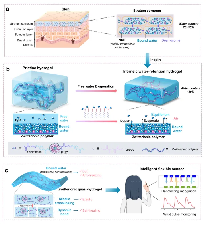 受皮肤角质层天然保湿机制启发,研究团队设计了一种全新两性离子水凝胶体系,仅由吸湿性高分子骨架和结合水构成,无需额外添加剂。