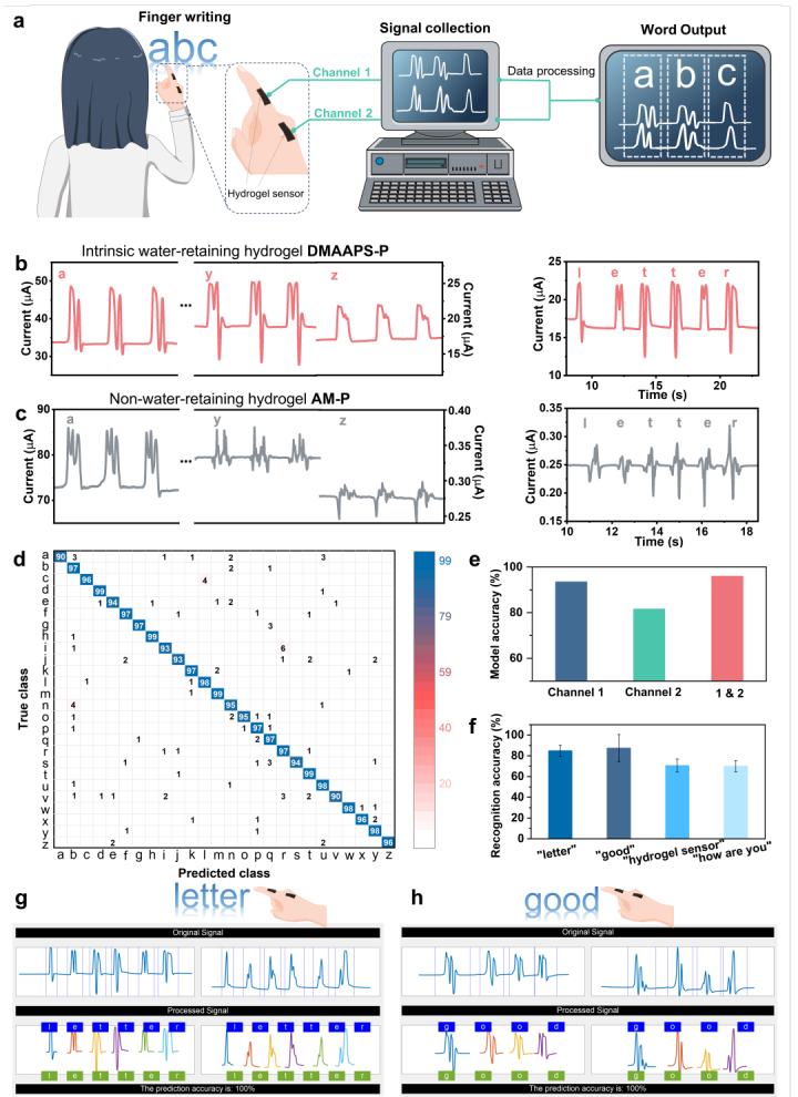 图4. 两性离子水凝胶传感器实现智能手部书写识别。