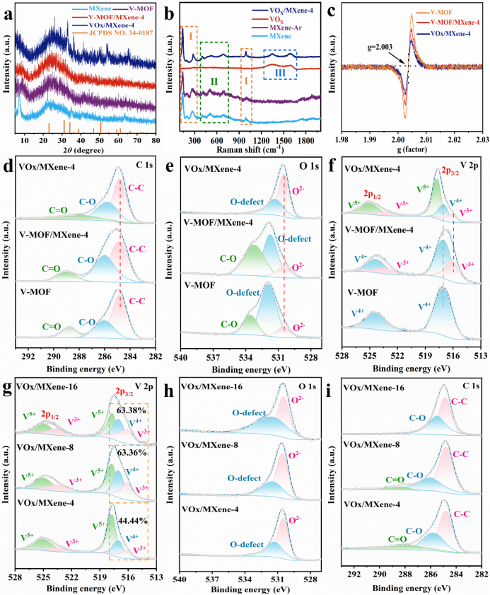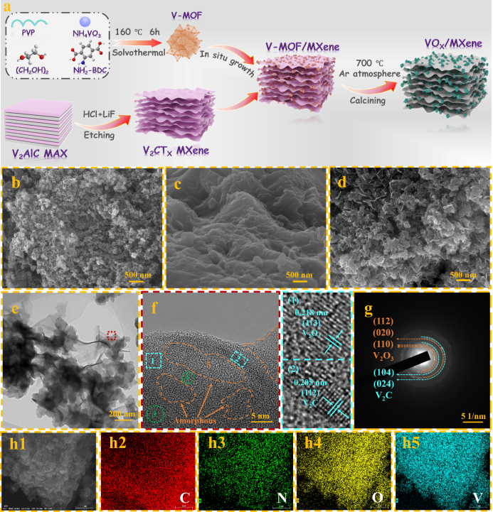通过一步溶剂热法成功制备V-MOF/MXene前驱体,经700°C氩气氛围退火获得VOₓ/MXene复合材料。