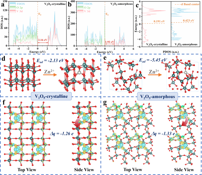 密度泛函理论计算深入揭示晶相-非晶相转变对材料电子结构和锌离子存储性能的影响机制。