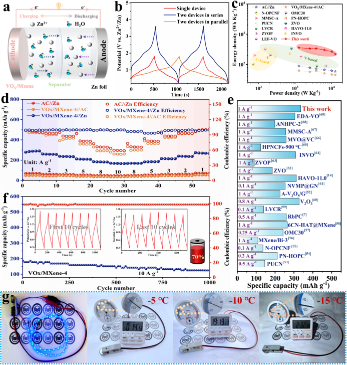 图5.VOX/MXene-4//Zn ZICs的稳定性、低温环境的实用性以及容量性能对比。