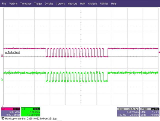 通过示波器测量控制脉冲信号,验证了系统20个控制脉冲的精确计数,与标度器结果完全一致,证实了同步机制的可靠性。