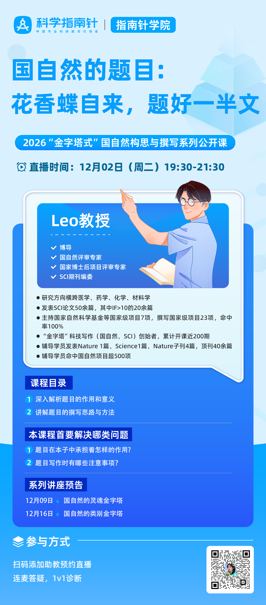 面对日益严峻的资助形势,科研人员需要更加专业的指导和支持。科学指南针特邀国自然评审专家Leo教授,将于12月2日(周二)晚19:30–21:30举办《花香蝶自来,题好一半文:2026"金字塔式"国自然构思与撰写》系列公开课。