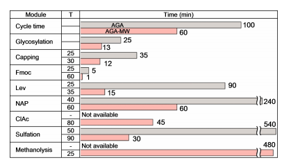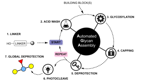 自动聚糖组装(AGA)是一种基于固相合成的先进技术,通过从还原端向非还原端逐步构建均质低聚糖链。其核心优势在于:固相载体固定生长中的糖链,避免了传统液相合成中繁琐的纯化步骤,实现全自动化顺序反应,包括临时保护基团的正交去除与合成后修饰。近年来,溶液相自动化装置亦取得进展,利用预活化策略从非还原端组装线性多糖,支持在线监测与规模放大,但仍需较多人工干预。