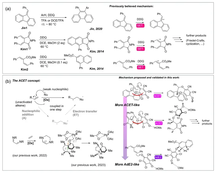 (a) 缺电子烯烃的典型 DDQ 促进氧化转化及其之前认为的机理。(b) ACET 的示意概念及本研究提出的关键机理。