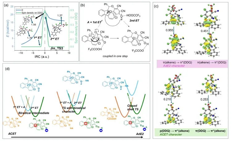 (a) Jin_TS3 的 IRC 分析。(b) 在氢键 TFA 存在下 DDQ 加成到 Jin1 的反应机理示意图。(c) Jin_TS3 的 ETS-NOCV 分析。(d) 从 ACET 到 AdE2 转变的 Marcus 分析。