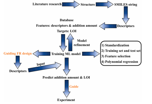 近年来,数据驱动方法如机器学习(ML)显著提升了材料设计效率。以环氧树脂(EPs)为例,其固有可燃性限制了应用,而添加阻燃剂(FRs)可提高LOI。传统卤系阻燃剂因环境问题逐渐被无卤替代品如有机含磷阻燃剂(OPFRs)取代。ML方法通过分析历史数据,预测新阻燃剂结构对LOI的影响,减少试错成本。