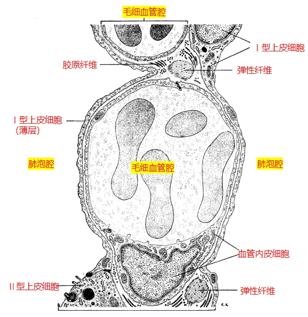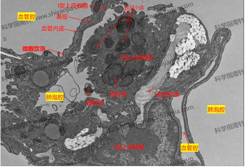 肺泡Ⅰ型上皮细胞胞质极薄,承担气体交换和液体平衡双重任务,其微胞饮泡密度直接指示细胞功能活性。