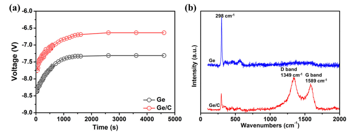 图1 (a)施加电流密度为80 mA cm-2时Ge和Ge/C电沉积过程中的电位变化。(b) Ge和Ge/C的拉曼光谱