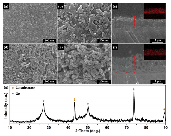 图2 (a, b) Cu衬底上Ge电沉积的SEM表面形貌,(c) Ge电沉积的横截面图和相应的Ge元素图(插图)。(d, e) Cu衬底上Ge/C电沉积的SEM表面形貌,(f) Ge/C电沉积的横截面图和相应的Ge元素图(插图)。(g) Ge/C的x射线衍射图。