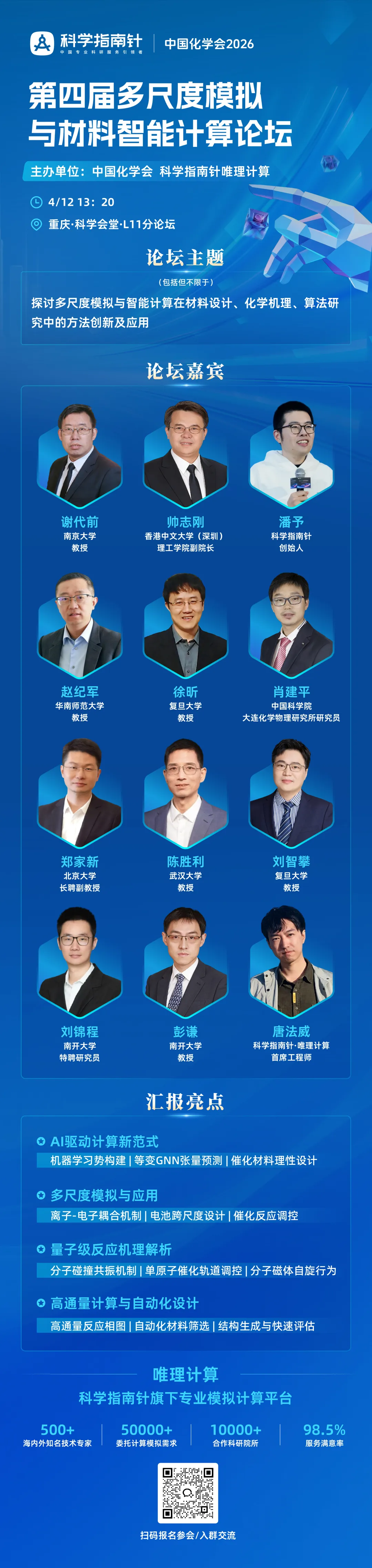 【摘要】 2026 年 3 月 24 日科学指南针服务平台带来中国化学会计算论坛重磅资讯,谢代前、帅志刚领衔,十余位行业大咖齐聚,论坛亮点抢先看,还有首样免 200 元专属优惠等你来领!