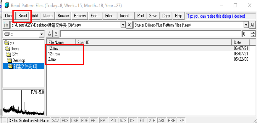 首先导入需要处理的图谱,点击“File”,选择“Patterns”,在跳出的“Read Pattern Files”对话框中选择路径。