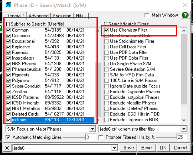 鼠标右键单击主工具栏中的“S/M”按钮,打开检索条件设置对话框。左侧是供选择的检索子库,根据样品的情况选择不同的PDF子库。