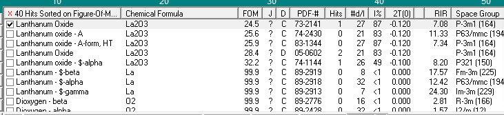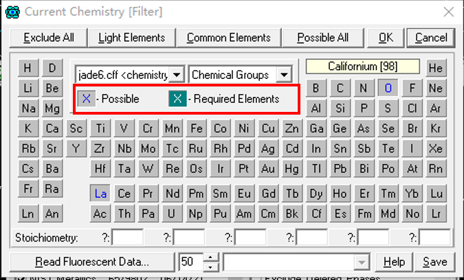 已知图例是氧化镧的XRD图谱结果,可以进一步精确检索范围。在“Use Chemistry Filter”前画上对勾,进入“元素周期表”对话框。根据对话框中的提示进行元素框选。