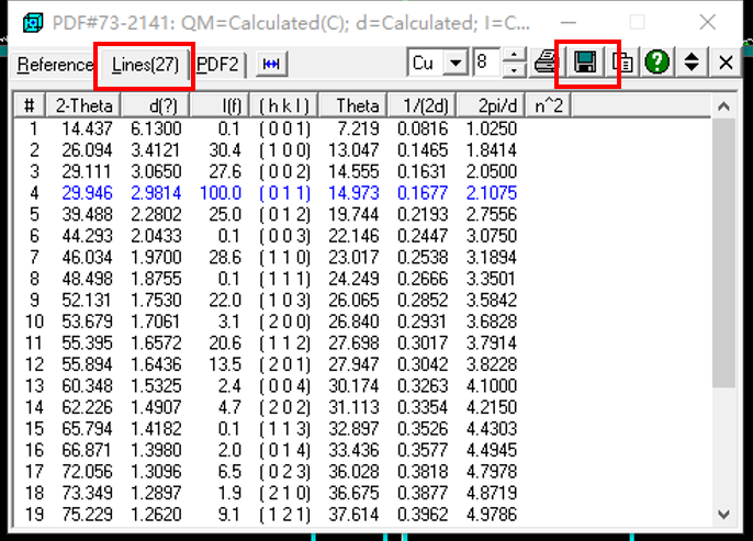 双击物相,打开所选择的PDF文件,选择“Lines”,查看PDF文件,单击“保存”按钮,可以保存PDF文件为“txt”文件,方便后续的其他处理。