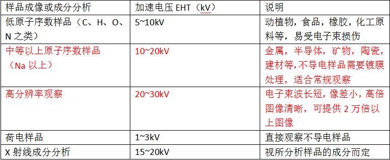 三、扫描电镜的参数调节扫描电镜的工作参数大致可分为加速电压,探针电流,物镜光阑,以及相消散的调节。下面我们一一展开,讨论一下这些参数对于获得的电子像的影响。1.加速电压的选择加速电压是扫描电镜的重要参数,一般来说,仪器提供的加速电压的范围为0.2~30kV,需要根据种类和分析目的进行选择。选择的依据如下表所示: