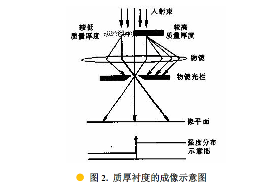 电子束被样品散射后,根据样品的性质不同,电子束的振幅和相位会发生相应的改变,形成振幅衬度像和相位衬度像,其中由于样品的质量(原子序数、密度等)或者厚度的差异造成的透射电子束强度的差异而形成的衬度称为质厚衬度,非晶材料的透射像衬度主要为质厚衬度像,如图2所示,入射电子透过样品时碰到的原子数越多即样品越厚,或者样品原子核库仑电场越强即原子序数或密度越大,被散射的大角度的电子越多,被挡在物镜光阑之外越多,成像系统接受的电子数越少,那么衬度高,反之衬度越低。