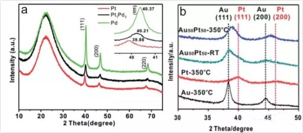 上图a 中给出了 Pd/m-SiO2, Pd/ m-SiO2 和 Pt1Pd3/ m-SiO2 的 XRD 图谱。请注意:很多时候,XRD 全谱很难直观地表现衍射图样的变化,而为了更好地说明情况,一般将某个特征峰(常见为主峰)进行放大(也可以在 XRD 测试时,只选取某个较小范围进行测试),然后比较其衍射峰位置。从图a 的插图(对 111 特征峰的放大)可以看出,Pt1Pd3 的衍射峰介于 Pd 和 Pt 之间,且峰型对称,说明形成的是 PtPd 合金。而b 图中 Au50Pt50-RT 没有形成合金结构,其特征衍射峰由 Au 和 Pd 的衍射峰叠加组成;而 Au50Pt50-350 的特征衍射峰很对称,且介于 Au 和 Pt 之间,说明形成了均一单相合金结构。这个对比实验可以用来说明高温焙烧对于合金形成的重要作用。