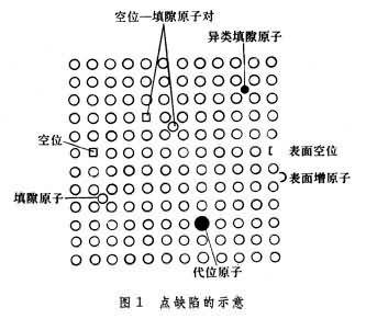 晶体中的缺陷有点缺陷、线缺陷、面缺陷等。而辐照损伤造 成的缺陷只有点缺陷,包括空位(晶格中原子被移除形成的空缺)和填隙原子(正常排序的点阵中插入的多余原子)。