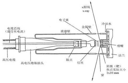 X射线发生器由X射线管、高压发生器、管压和管流稳定电路以及保护电路等组成。这里着重介绍X射线管。X射线管的实质是个真空二极管,其阴极是钨丝,阳极为金属片。