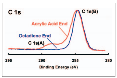 化学梯度是基板表面两点之间的化学变化的区域,在单实验中探测不同表面化学性质的影响时十分有用。XPS和角度分辨XPS可用于表征表面存在化学梯度的超薄共聚物,以1,7-辛二烯和丙烯酸共聚物为例,此类共聚物以等离子体沉积的方法制备,随基板的运动,两种挥发性的单体比例不断改变,辛二烯的量减少,丙烯酸单体的量增加,最后基板的一端是辛二烯,中间是辛二烯和丙烯酸的共聚物,另一端是丙烯酸。