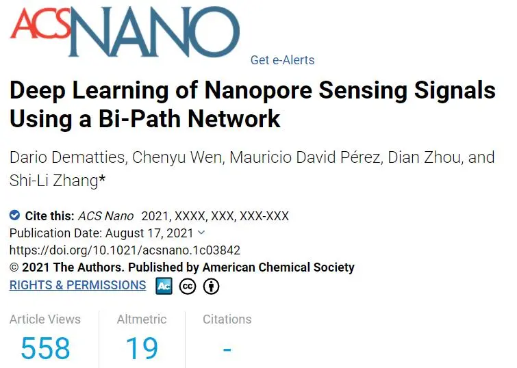 Dario Dematties, Chenyu Wen, Mauricio David Pérez,Dian Zhou, and Shi-Li Zhang, Deep Learning of Nanopore Sensing Signals Using a Bi-Path Network, ACS Nano Article ASAP. DOI: 10.1021/acsnano.1c03842