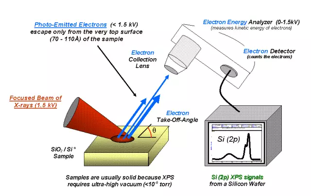 仪器材料的功函数Φ是一个定值,约为 4 eV,入射X光子能量已知,这样,如果测出电子的动能Ek,便可得到固体样品电子的结合能。各种原子,分子的轨道电子结合能是一定的。因此,通过对样品产生的光子能量的测定,就可以了解样品中元素的组成。元素所处的化学环境不同,其结合能会有微小的差别,这种由化学环境不同引起的结合能的微小差别叫化学位移,由化学位移的大小可以确定元素所处的状态。例如某元素失去电子成为离子后,其结合能会增加,如果得到电子成为负离子,则结合能会降低。因此,利用化学位移值可以分析元素的化合价和存在形式。