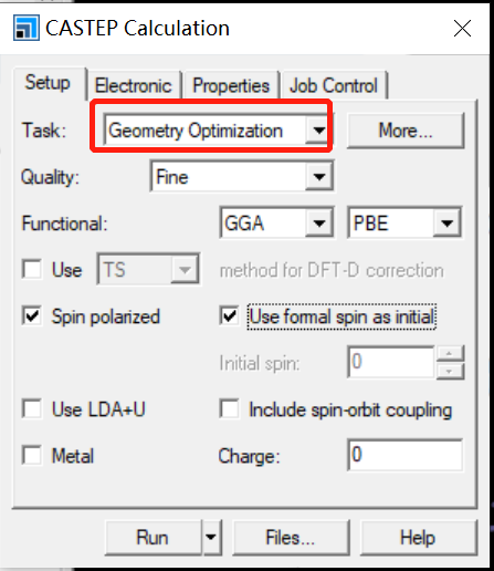 导入要计算的结构文件,选择CASTEP模块,点击Calculation,打开以下对话框,选择Geometry Optimization。