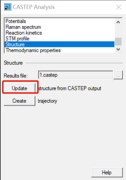 在包含计算输出文件的目录下,选择CASTEP模块,点击Analysis,打开以下对话框。选择Structure,在Results file处导入后缀为castep的计算输出文件,点击Update。