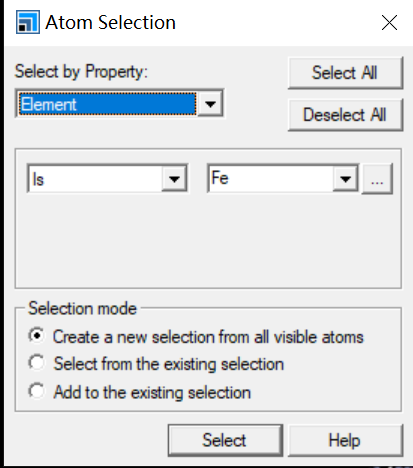 首先,点击Edit,选择Atom Selection,打开如下对话框,点击要选择的片段,这个根据需要,自行设置。设置好后,点击Select后,被选择的片段则被标亮。