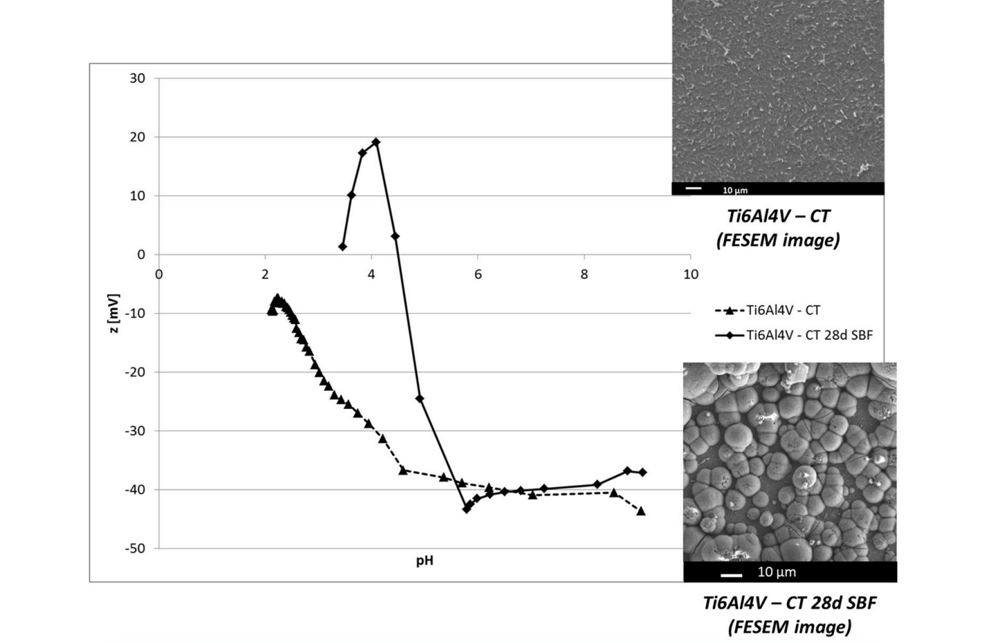 图 1 Ti6Al4V – CT 和 Ti6Al4V – CT 在 SBF 中放置 28 天后的 Zeta 电位与 pH 的关系【1】