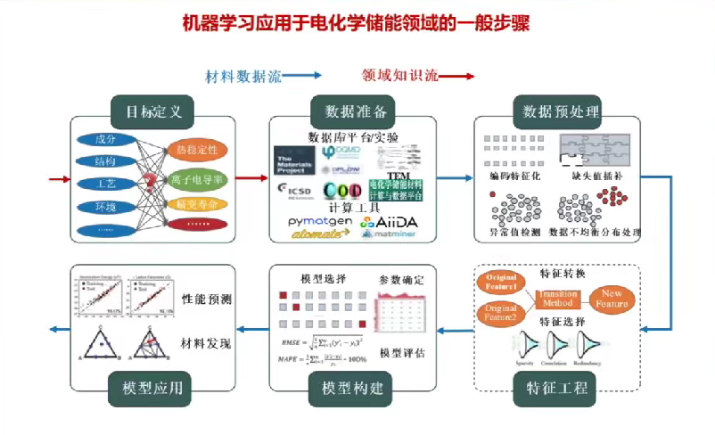 机器学习流程涵盖目标定义、数据准备、预处理、特征工程、模型构建与模型评估与应用六大步骤:首先明确目标(如预明确具体的材料体系及拟学习的构效关系),整合实验与计算数据;其次对原始数据进行清洗、转换、归一等操作,旨在为机器学习模型提供高质量的学习样本,提出九个维度下评估数据质量治理的概念。接着利用特征工程对描述符空间进行降维以降低模型拟合难度;随后进行机器学习模型的构建,主要包括模型训练和模型评估。选择算法(如随机森林、神经网络),调参优化并验证性能;最终输出预测结果或新材料设计方案。