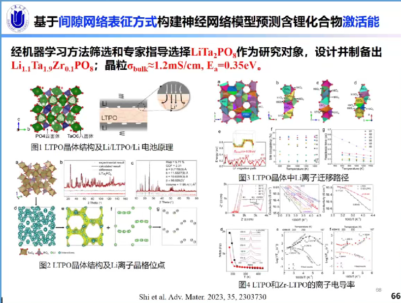 通过以关系三元组为基准,构建材料知识图谱并从中探索构效关系知识(1808篇文献提取24类构效关系)。针对不同材料体系等复杂问题,采用分而治之机器学习——从分属性、分样本分结构等维度,自适应建模使构效关系精准刻画。例如通过机器学习方法筛选选择LiTa2PO8作为研究对象并设计制备出Li1.1Ta1.9Zr0.1PO8,使其常温离子电导率达到1.2 S/cm。其主要基于间隙网络表征方式构建神经网络明星预测含锂化合物激活能。
