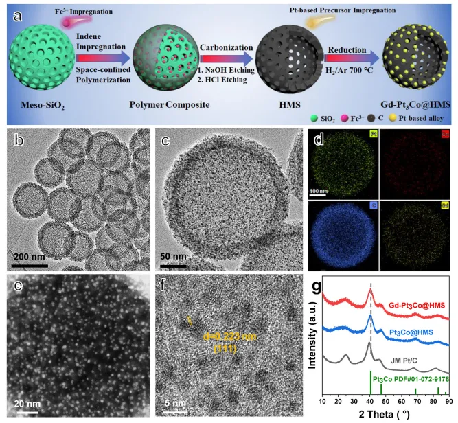 近年来,通过引入钌(Ru)、钨(W)、镓(Ga)以及钼(Mo)等元素进行原子掺杂已成为提升催化剂活性与稳定性的有效策略。基于此,本研究报道了一种创新性合成方法,成功制备出Gd-Pt3Co纳米颗粒,并将其负载于空心介孔碳球(Gd-Pt3Co@HMS)上。该材料基于茚的空间限域聚合技术制备而成,展现出优异的催化性能。