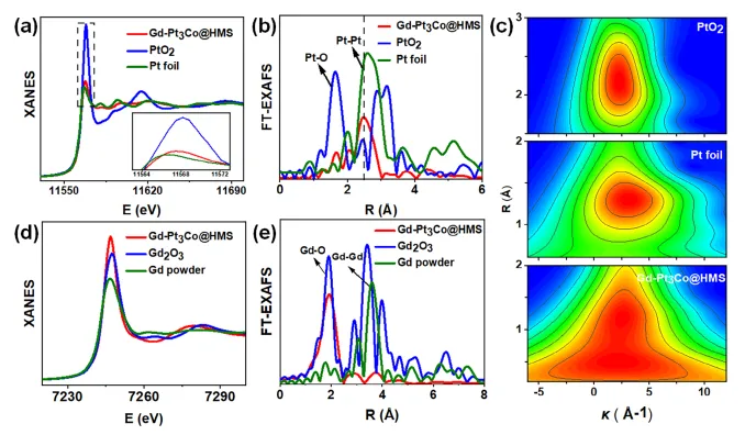 图2. (a) Pt L3边缘的X射线吸收近边结构(XANES)谱图,图a显示了放大的区域,来突出细节。(b) Gd-Pt3Co@HMS 的扩展X射线吸收精细结构(EXAFS)谱图。(c) Pt L3边缘的连续小波变换(WT)分析,包括Pt箔、PtO2和Gd-Pt3Co@HMS。(d) Gd L3边缘的X射线近边吸收谱仪(XANES)谱图。(e) Gd粉末、Gd2O3和Gd-Pt3Co@HMS的EXAFS谱图。