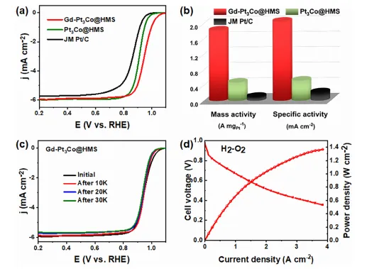中国科学院青岛生物能源与过程研究所李亚东等人指出,开发适用于氧还原反应(ORR)的合适碳载体以及高效的 Pt 基纳米颗粒对于加速质子交换膜燃料电池(PEMFC)的商业化进程具有至关重要的意义。在本研究中,首次通过空间限制聚合结合后续退火的方法成功合成了茚衍生的空心介孔碳球。随后,将Gd-Pt3Co纳米颗粒嵌入空心介孔碳球(Gd-Pt3Co@HMS)中,所制备的催化剂在 0.9 V 下展现出卓越的质量活性(MA),达到 1.83 A mgPt-1 。此外,Gd-Pt3Co@HMS催化剂表现出优异的耐久性,其半波电位(E1/2)在经历 30,000 次循环后几乎未发生显著变化。在氢氧全电池测试中,采用 Gd-Pt3Co@HMS催化剂的膜电极组件(MEA)在 0.6 V 条件下实现了 1.44 A cm-2的电流密度和1.4 W cm-2 的峰值功率密度。这种性能提升可归因于Gd-Pt3Co(111) 表面上 Pt-O键结合强度的增强,从而显著降低了 ΔEO。此外,由于Gd掺杂优化了催化剂的表面能,使其在ORR过程中表现出卓越的耐久性。