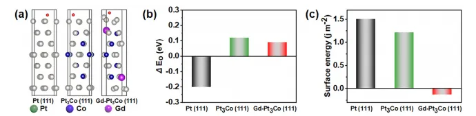 图4 . (a) 理论模型结构。(b) 纯Pt、Pt3Co和Gd-Pt3Co (111)晶面的氧结合能(ΔEO),最佳结合能设为零。(c) 纯Pt、Pt3Co和Gd-Pt3Co (111)晶面的表面能。