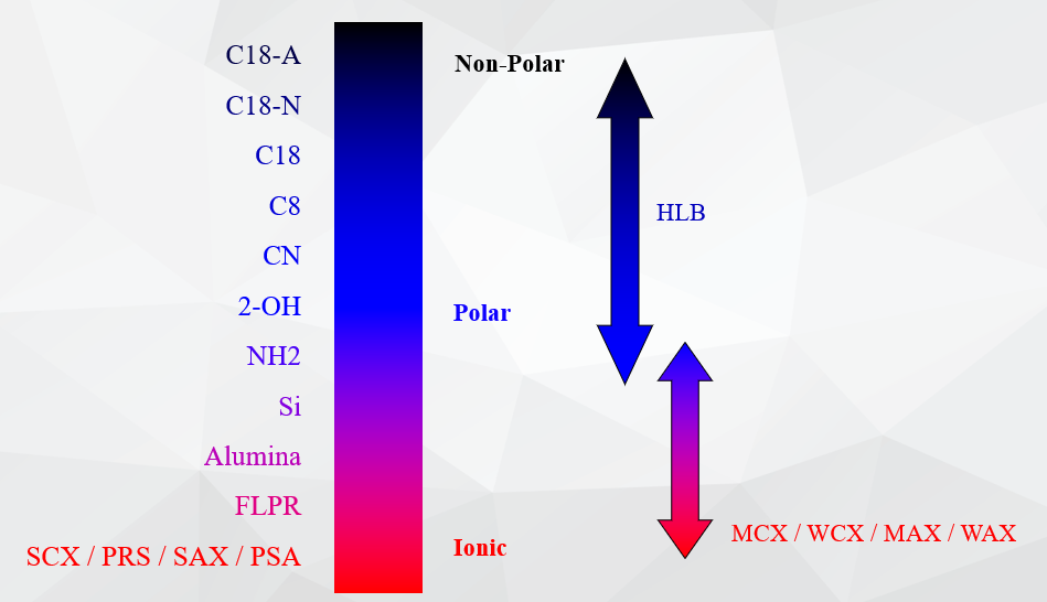 1)反相SPE:适用于非极性/弱极性化合物(如脂溶性药物、环境污染物)。