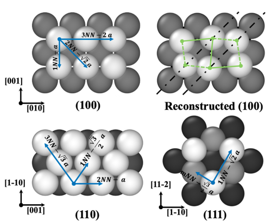图 1.(1 0 0)、(1 1 0)、(1 1 1) 和重构 (1 0 0) 表面上点缺陷的最近邻位点的顶视图。