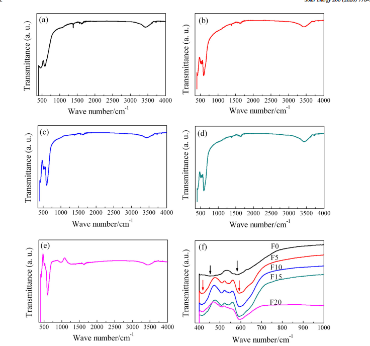下图展示了不同铁掺杂量(F0, F5, F10, F15, F20)样品的红外光谱(400-1000 cm⁻¹范围),直观反映了铁掺杂对材料红外吸收特性的影响(图1f 进行了透射率对比):
