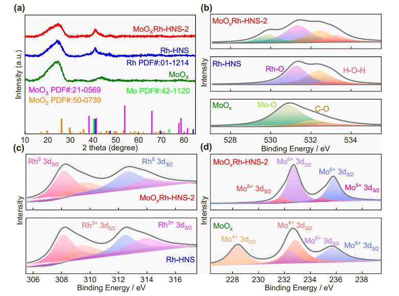 • Rh 3d谱(图1c)清晰显示了金属Rh的特征峰。值得注意的是,与纯Rh-HNS相比,MoOxRh-HNS-2中Rh 3d峰的结合能略有变化(如向低结合能偏移),表明MoOx的引入改变了Rh原子的电子结构,使其电子密度略有增加(部分还原)。