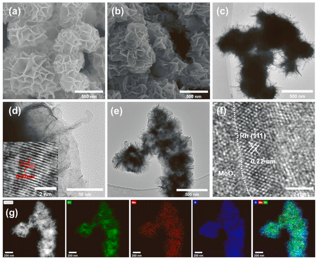 • 高角度环形暗场扫描透射电镜(HAADF-STEM)及相应的元素分布图(图2g)清晰证实,Mo和O元素在Rh纳米片上均匀分布,直观展示了MoOx对Rh纳米片的成功修饰。