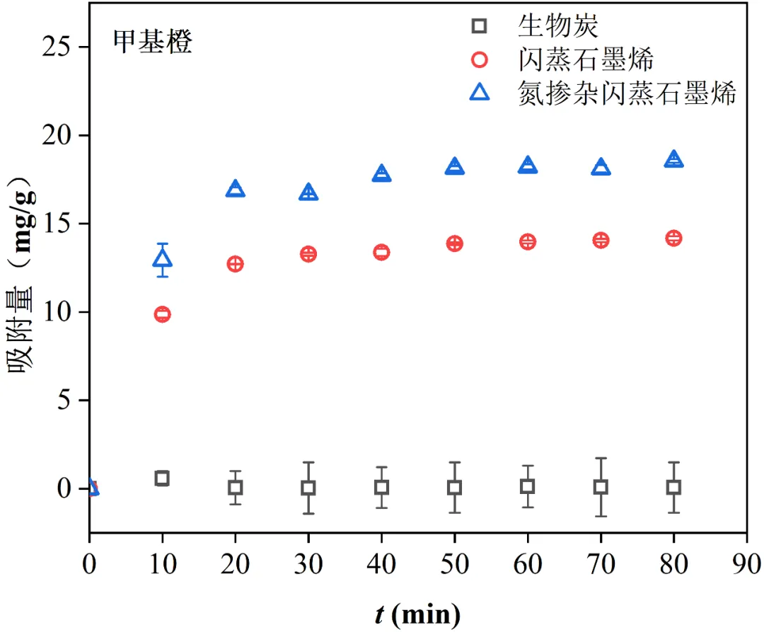 图5 生物炭、闪蒸石墨烯、氮掺杂闪蒸石墨烯对染料污染物甲基橙的吸附性能比较
