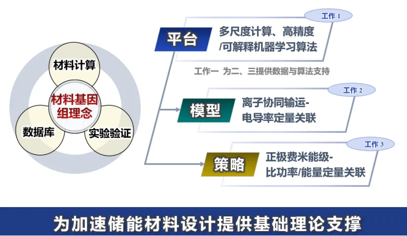 电化学储能体系的关键是材料。传统方法从材料的发现到应用往往需要十几年,很难满足产业界对更高性能电化学储能体系的要求。因此,迫切期望从学科交叉的角度,有机地融合理论、计算和实验方法,理解电池材料中电子/离子输运协同调控、界面电化学稳定性等关键科学问题,加快新材料和新体系的研发速度。